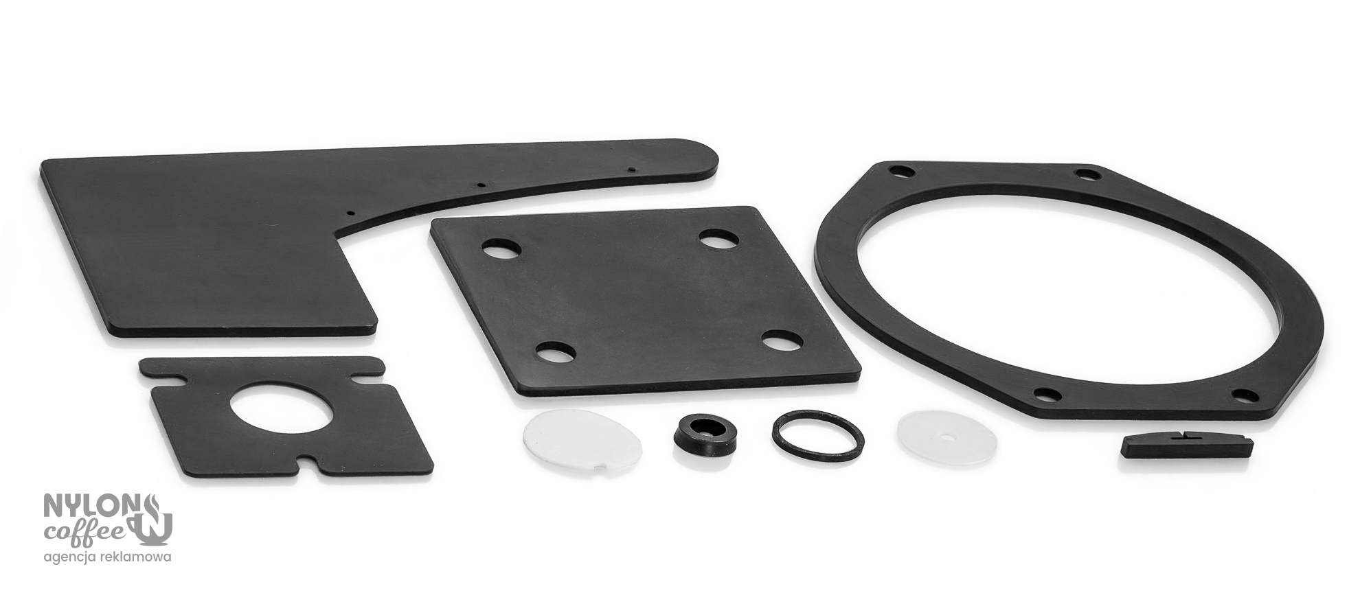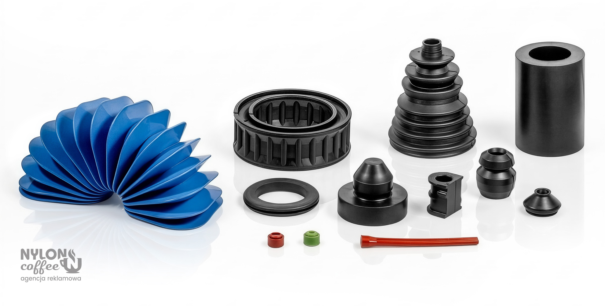 Sesja fotograficzna studyjna produktowa kompozycyjna (aranżacyjna) komponentów gumowo-metalowych, Piastów